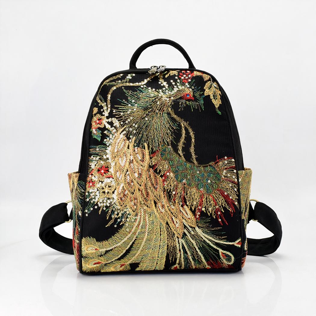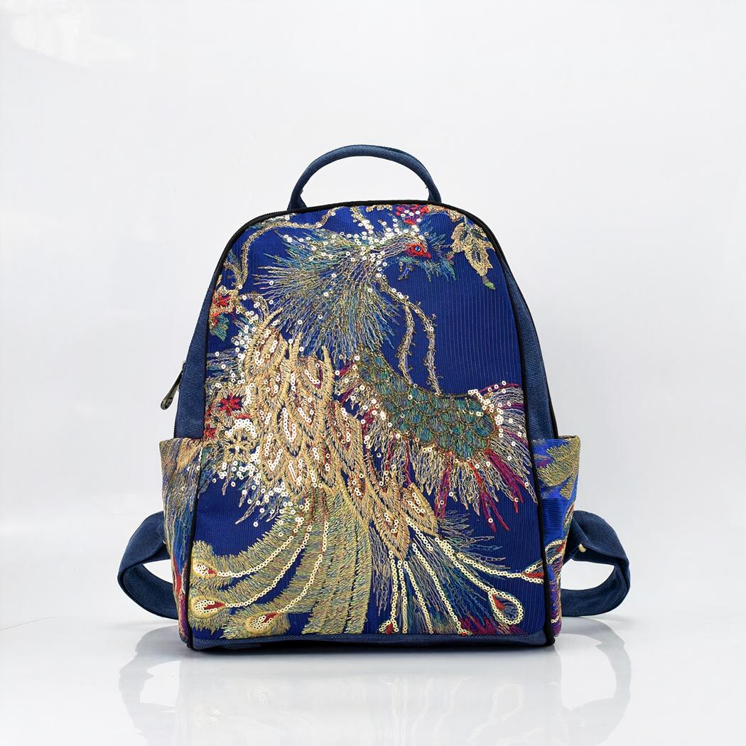 Deze dames rugzak van geborduurde zijde is een luxe stuk dat een unieke en elegante look biedt.