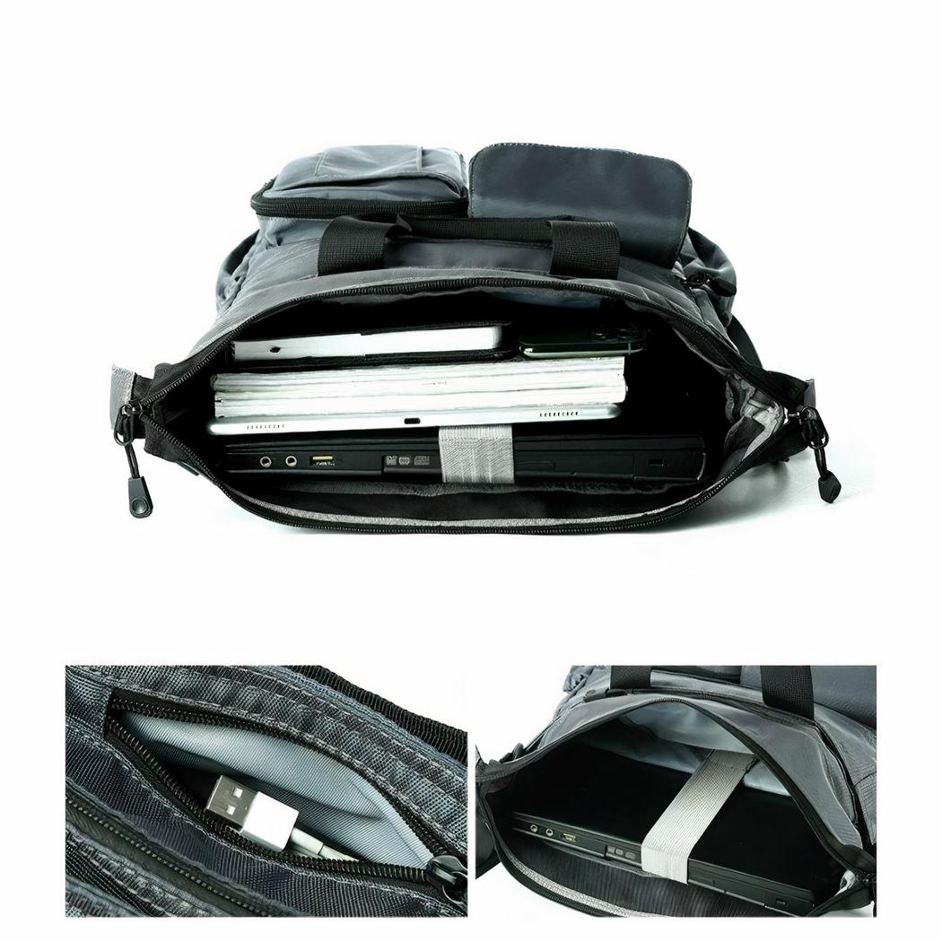 Wie zegtmulti-pocket zegt multi-gebruik. Deze vintage herenrugzakis zowel praktisch als polyvalent.U kunt hem zowel voor op reis als naar kantoor gebruiken. Draag hem over een schouder, op uw rug of in uw hand als u dat wilt. En waar u ook bent, gebruik de USB-poort om uw smartphone op te laden.